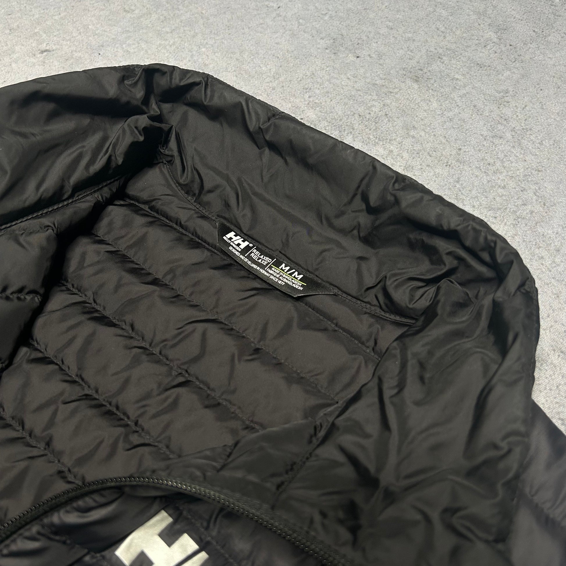 This Helly Hansen gilet is a versatile outdoor staple, perfect for layering in transitional weather. Featuring a classic horizontal quilted design in a sleek black colorway, it offers warmth without bulk. The chest displays the signature "HH" logo in contrasting white. Functional details include a full-zip closure, a protective high collar, and secure side pockets. A practical and stylish piece that fits seamlessly into any Gorpcore or casual wardrobe. Fit Note: Tagged Size M, but with a pit-to-pit of 56cm, it offers a relaxed fit that can also accommodate a slim Large (L).