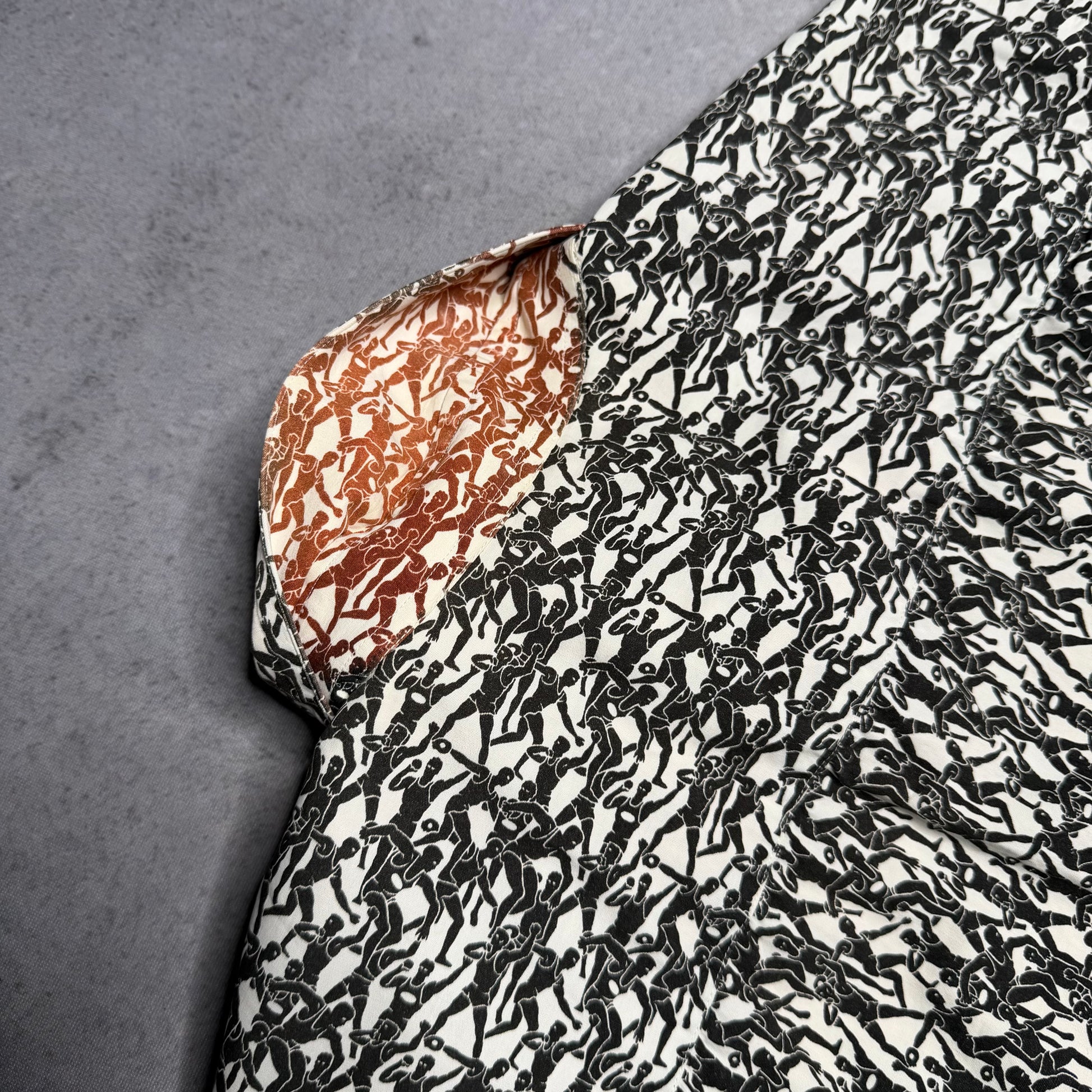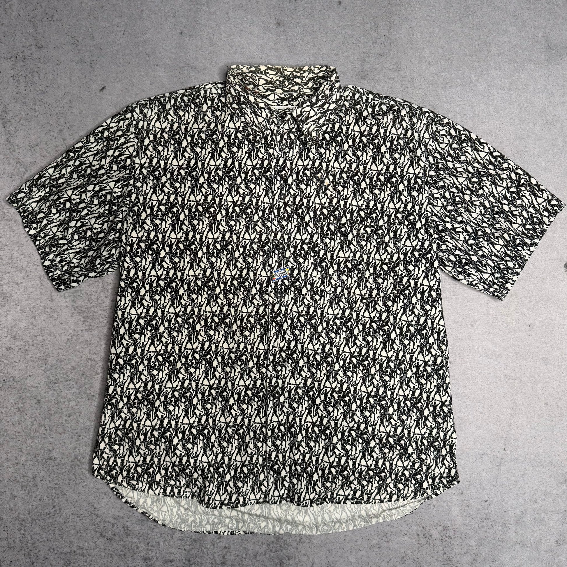 This incredibly rare Missoni Sport shirt is a true archival gem from the early 90s, featuring a striking Discobolus (Discus Thrower) all-over print. Handmade in Italy, it channels that iconic Tony Soprano aesthetic with its relaxed, boxy silhouette and bold monochrome design. While this piece shows visible signs of age with several discolorations, these flaws add to its authentic, lived-in character. Style this statement piece open over a white tank top with pleated dress trousers and loafers for a sophisticated leisurewear look.