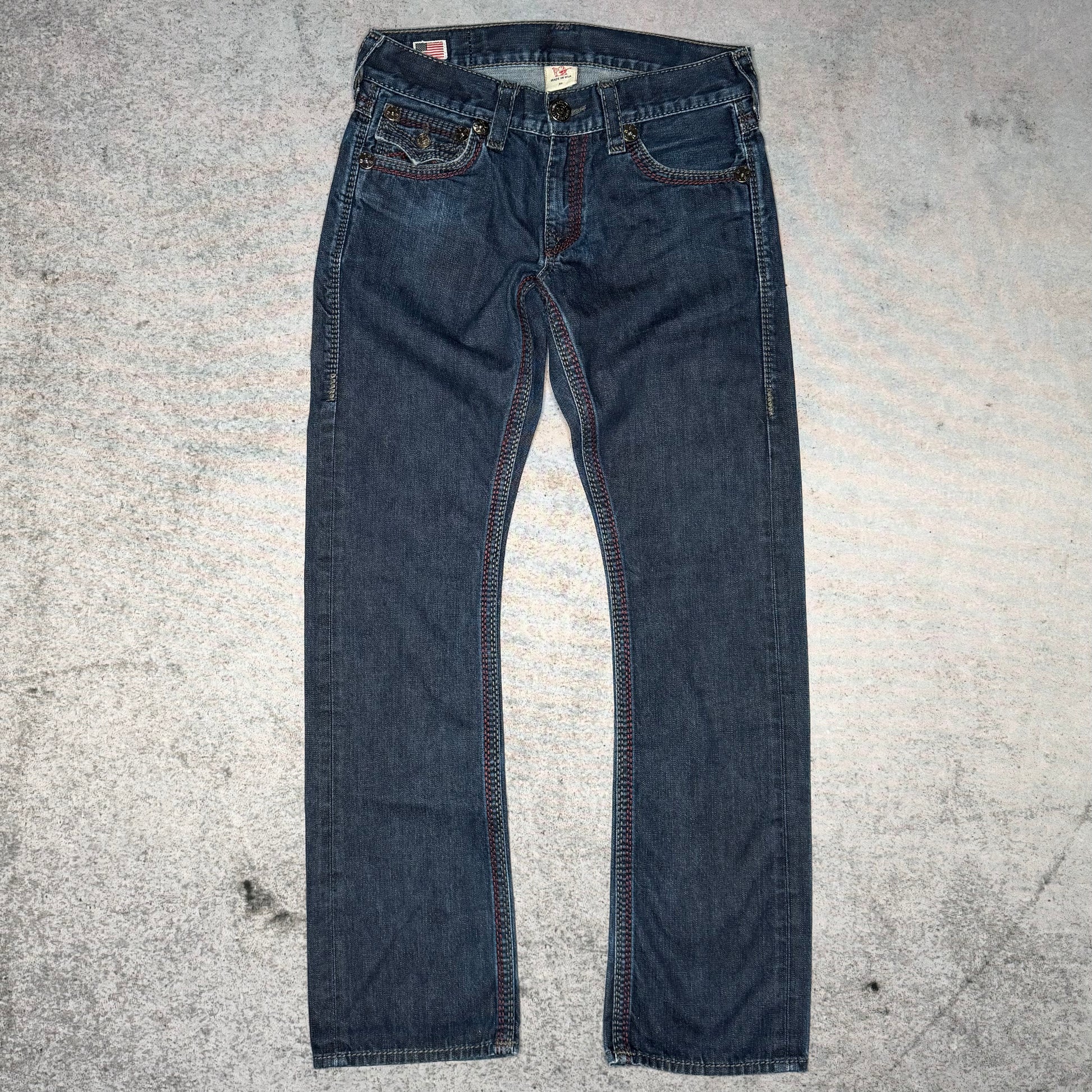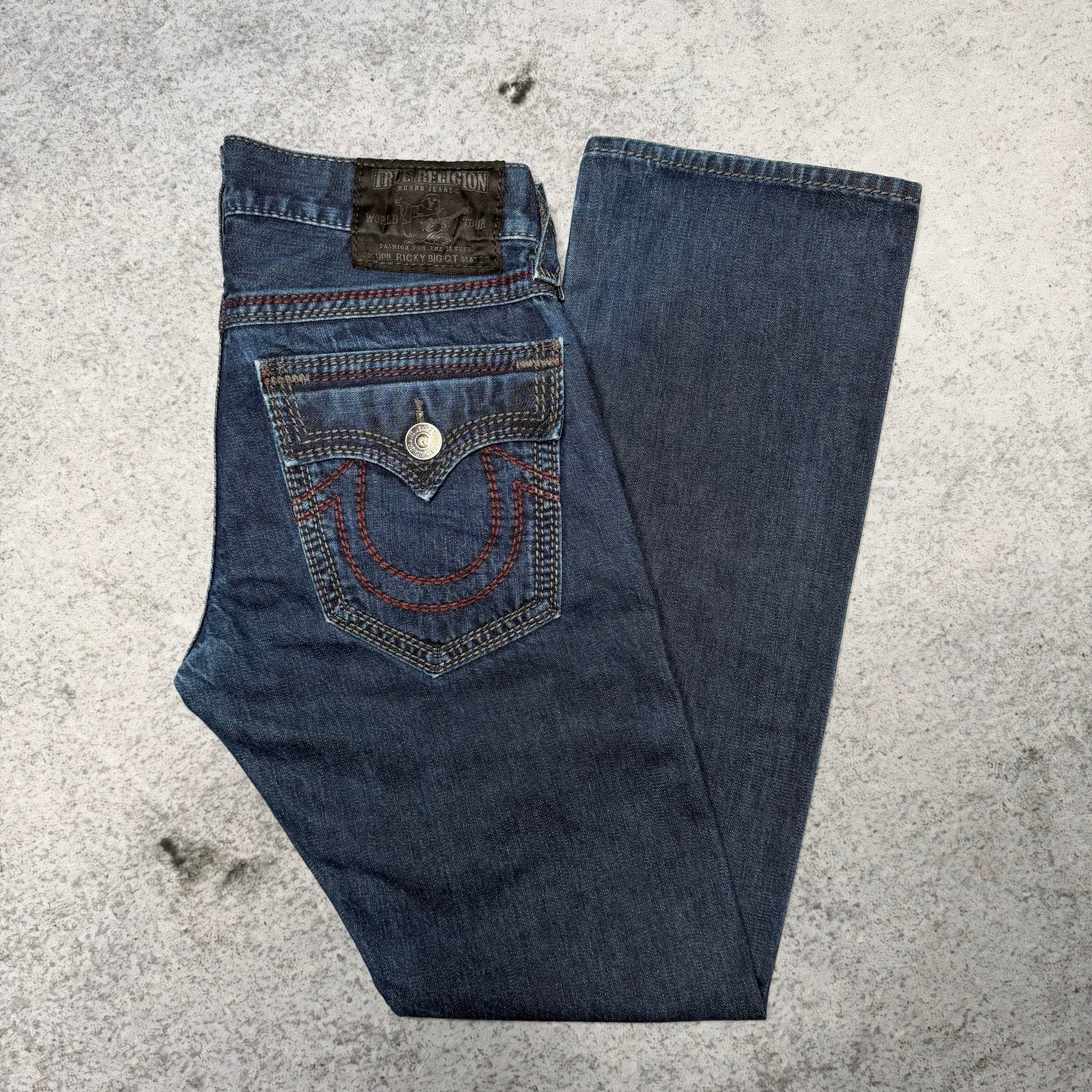 Rare sought-after True Religion Ricky Big QT Denim with Big Quad Thread Contrast Stitched Horseshoe Logo on backpockets. Made in USA from highest quality materials.