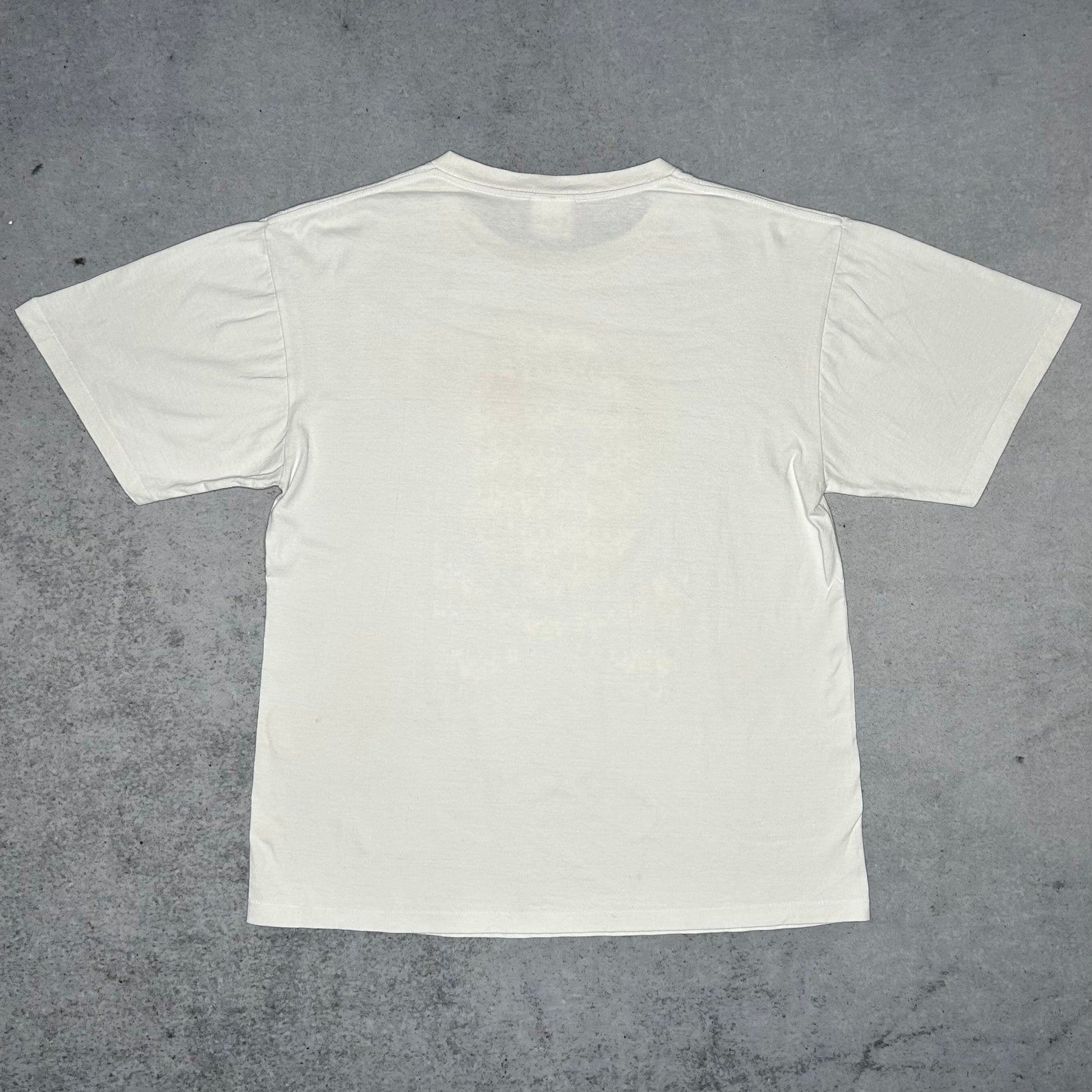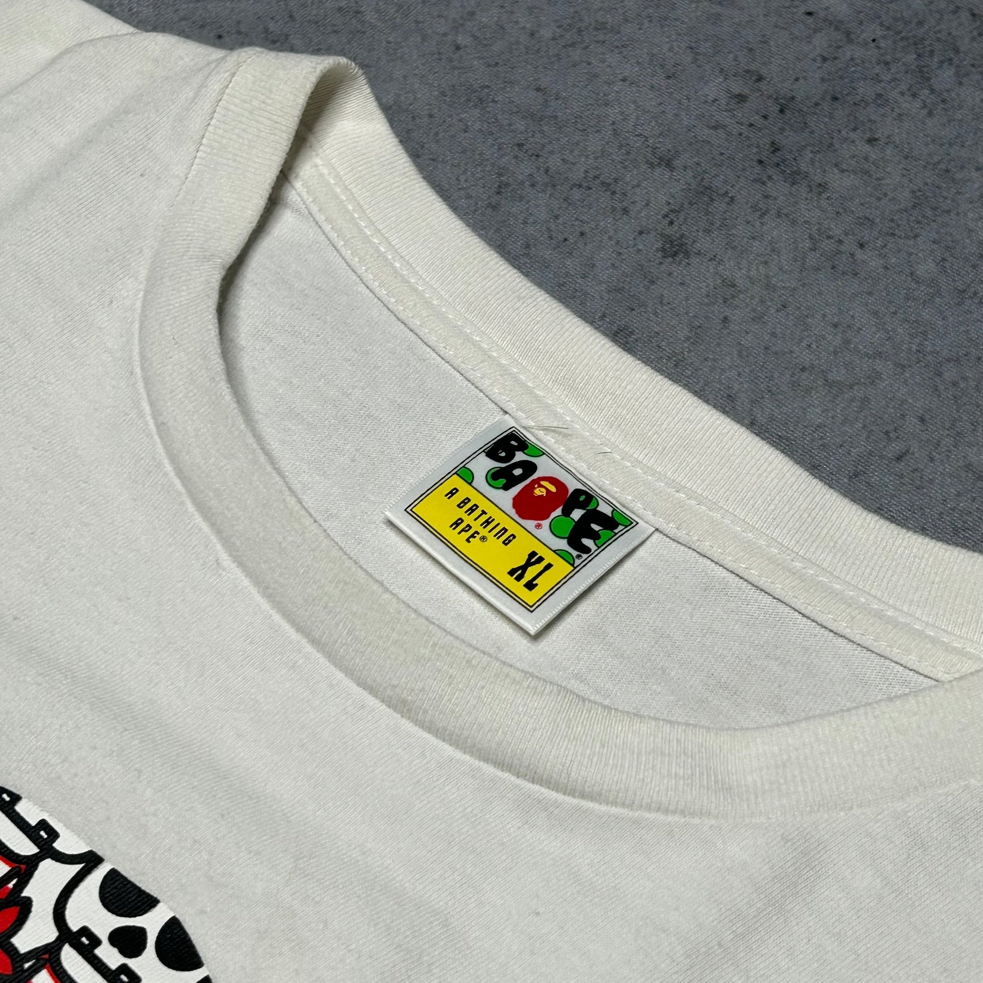 This A Bathing Ape (BAPE) t-shirt is a rare gem from the brand's iconic "Pirate Store" line. It features a large, playful graphic on the front: the legendary Baby Milo head reimagined as a skull and crossbones, filled with a vibrant pattern of mini pirate Milos. This tee captures the peak of Japanese Nigo-era streetwear aesthetic. Fit Note: While tagged XL, it also fits a modern Large (L) — a typical characteristic of BAPE's Japanese sizing.