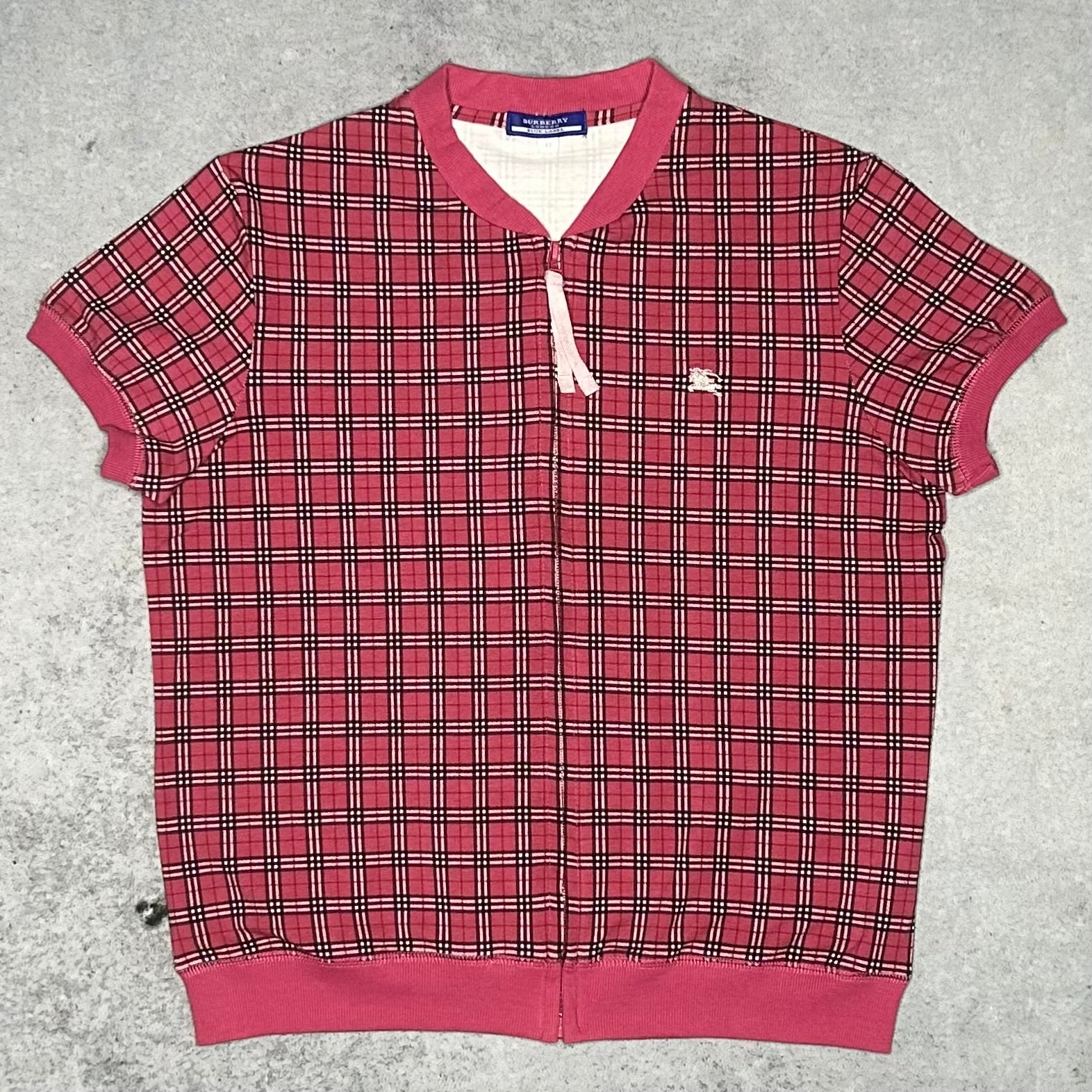 This Burberry Blue Label top is a rare vintage gem from the brand's Japanese exclusive line. Featuring the coveted Red Nova Check / Tartan pattern, it combines British heritage with 2000s Harajuku street style. Unlike standard tops, this piece features a full-zip closure, making it versatile enough to be worn as a top or a lightweight short-sleeve cardigan/jacket. It is finished with the iconic Equestrian Knight logo embroidered on the chest. The Size 42 fits comfortably like a modern Medium (M).