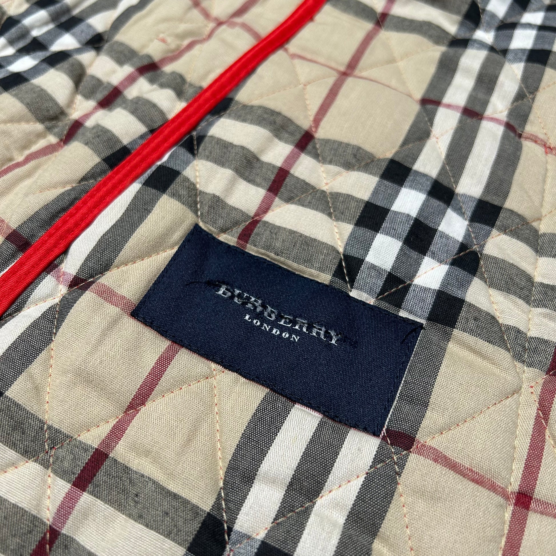 This Burberry gilet is a vibrant take on the brand's classic equestrian aesthetic. Featuring traditional diamond quilting in a striking bright red, it is fully lined with the iconic Nova Check pattern, which is stylishly visible at the collar. The design includes a snap-button front and patch pockets, offering a slim, tailored fit perfect for layering over knitwear or shirts.