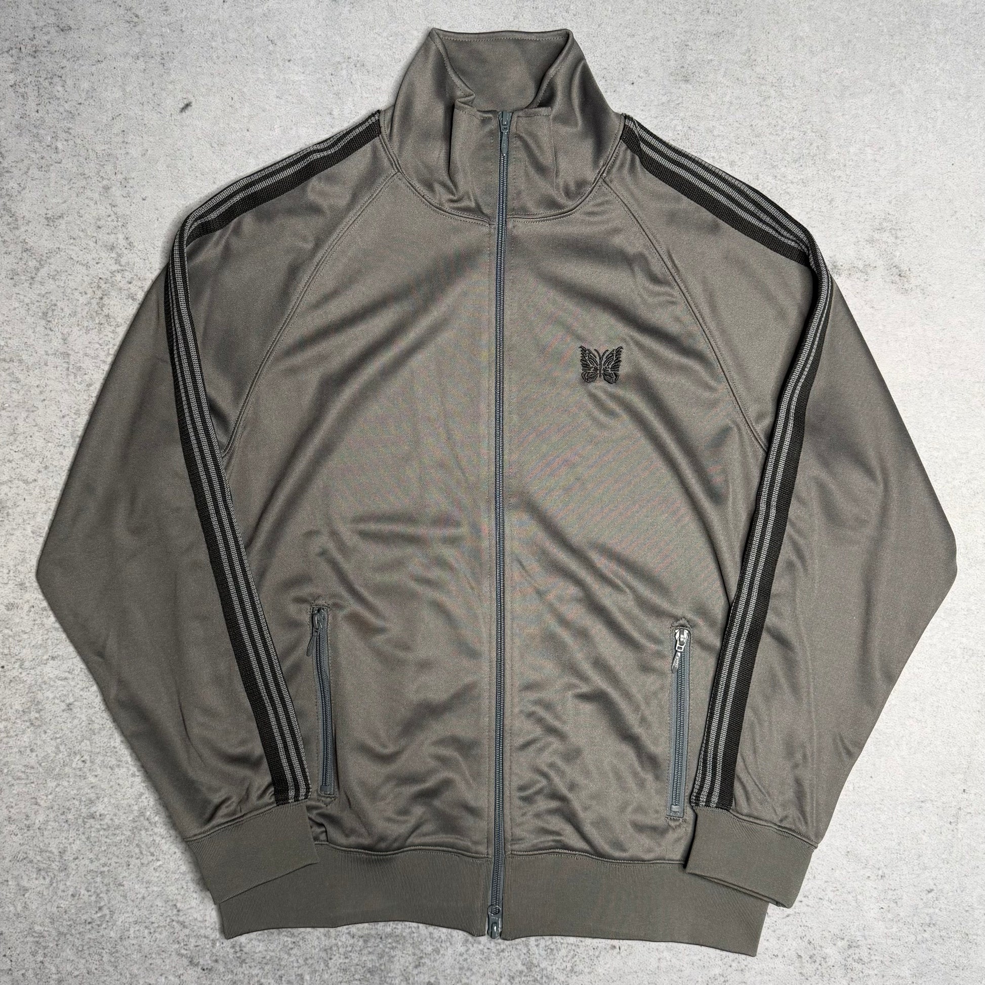 This Needles track jacket is a cornerstone of modern Japanese streetwear, originally retailing for approximately 350-400€. Crafted from the brand's signature premium poly-smooth fabric, it comes in a sophisticated grey colorway accented by contrasting black side tape striping. The design is finished with the iconic Papillon (butterfly) embroidery on the chest, blending sportswear utility with high-end fashion aesthetics. This piece is in very good condition, offering a premium look and feel.