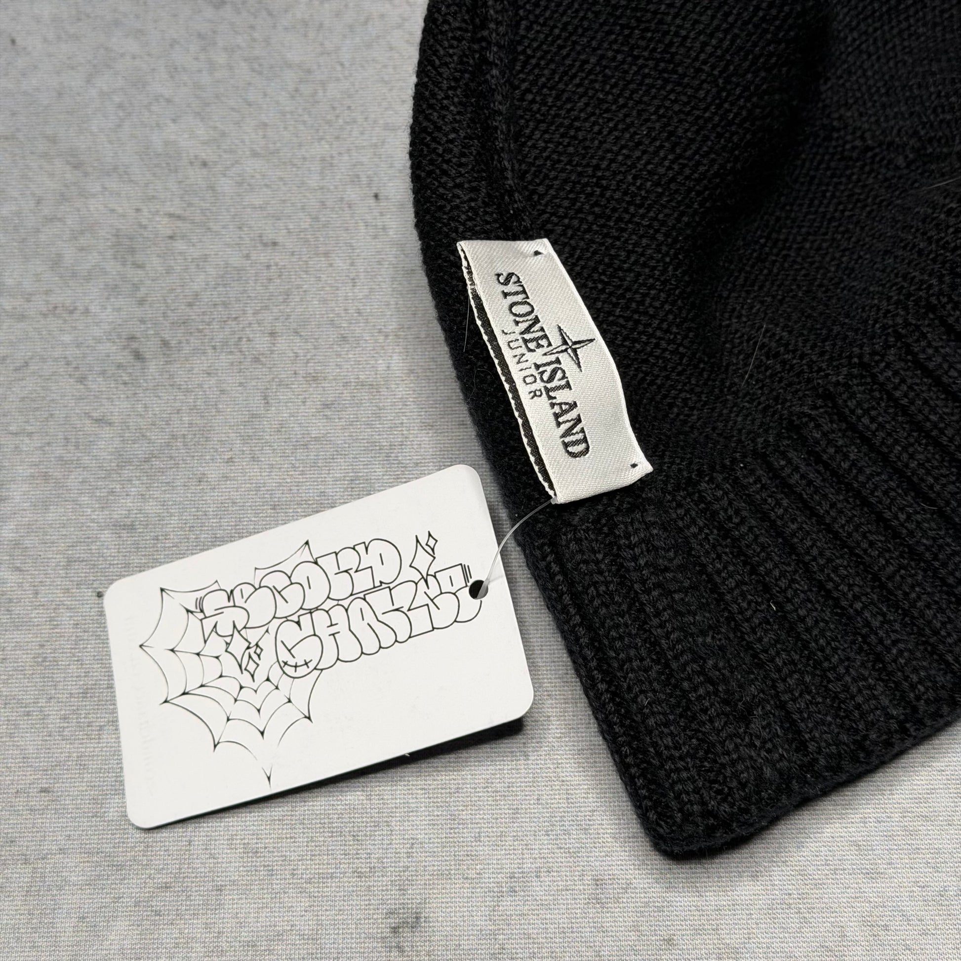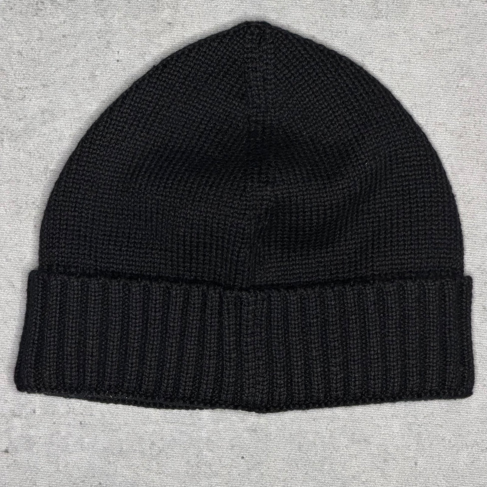 This Stone Island beanie is a premium accessory from the Junior Collection, crafted from amazing quality wool in a deep black colorway. Despite being tagged as Junior Size 3, the flexible ribbed construction offers a versatile One Size fit that comfortably accommodates most adult head sizes. The design is defined by a standout white contrast Compass patch on the fold-over cuff, providing a sharp, monochromatic alternative to the standard badge. This piece is in like new condition, showing no signs of wear.