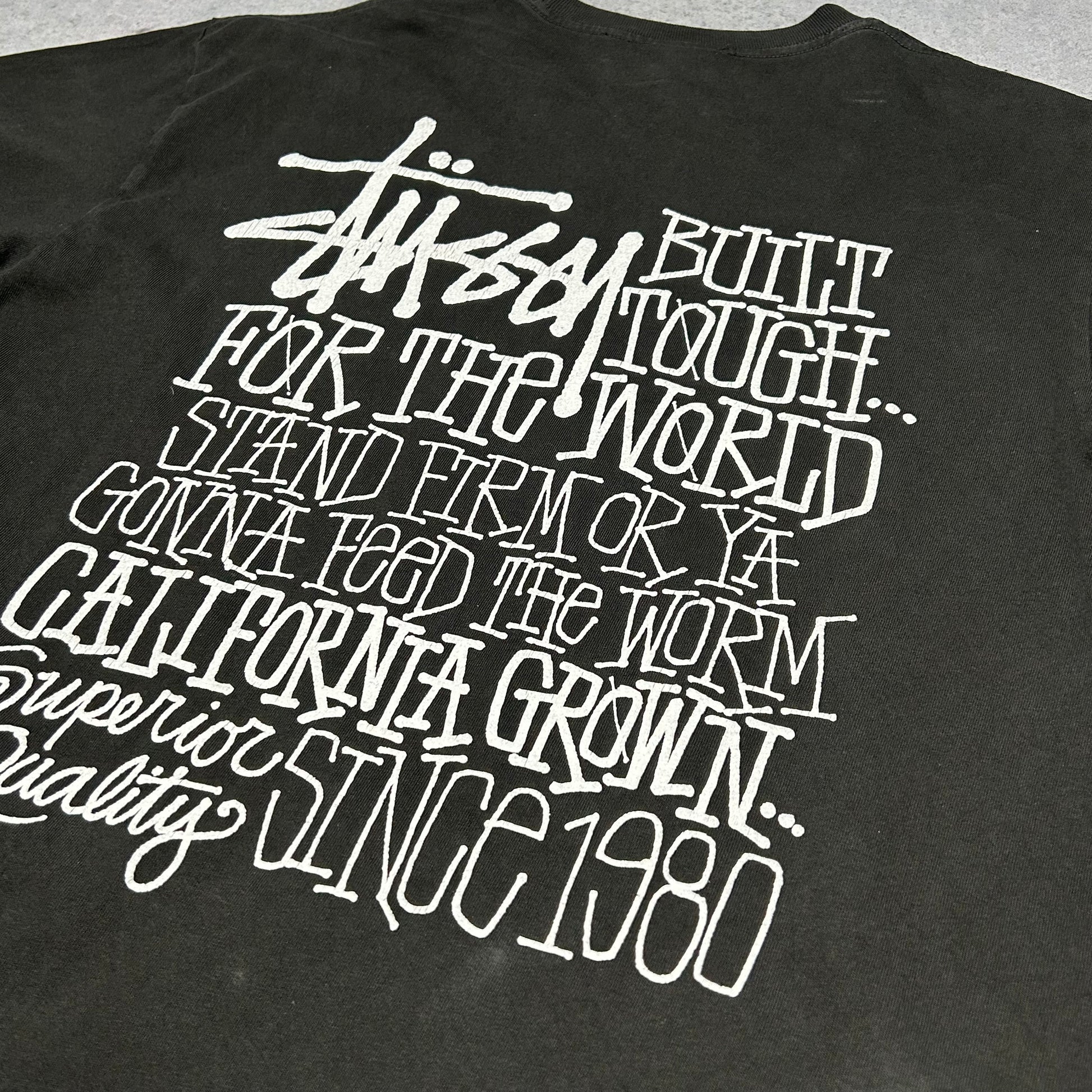 This Stüssy T-shirt is a rare OG version manufactured in the USA, distinguishing it from later re-releases. It features the iconic "California Grown" artwork on the back, celebrating the brand's roots "Since 1980" with the classic "Built Tough Worldwide" slogan. Crafted from pigment-dyed cotton, the fabric has a unique, washed-out vintage aesthetic and a substantial feel. Although tagged Size L, the cut is significantly oversized and fits like an XL, offering the relaxed, boxy drape that defines authentic streetwear.