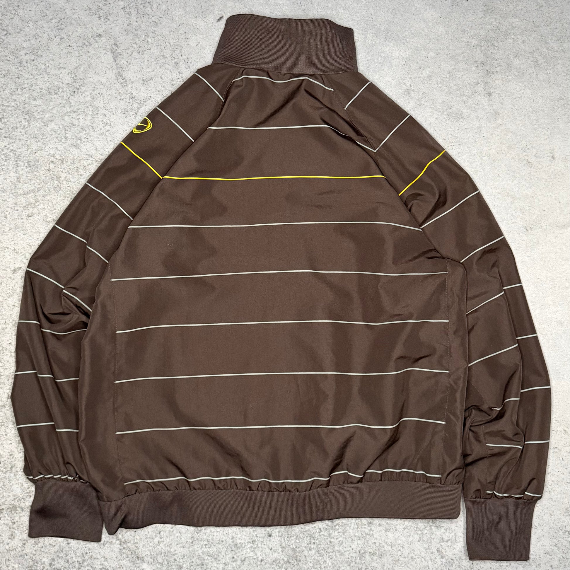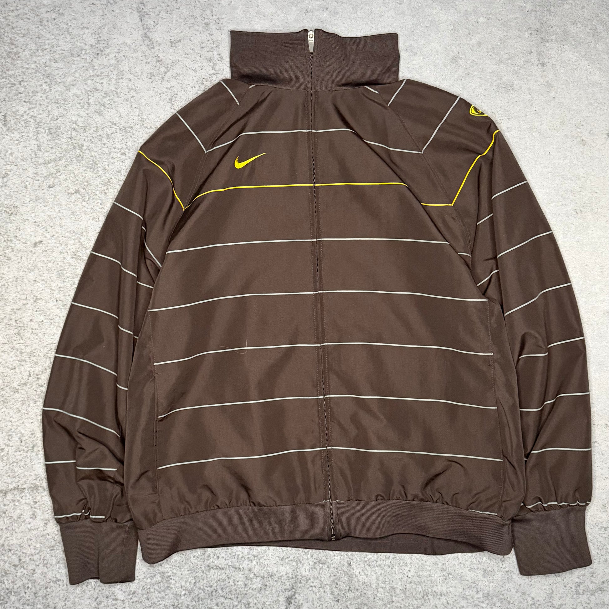 This Nike 00s Striped Track Jacket in a rare Mocha Brown colorway is a standout piece from the early 2000s Total 90 era. Sharing the same iconic pinstripe template worn by FC Barcelona during their legendary 2008/09 season, this jacket is a true piece of football heritage. The unique white pinstripe pattern and vibrant yellow Swoosh accents pop against the dark base, offering a sophisticated alternative to standard track tops while fitting perfectly into the modern blokecore trend.